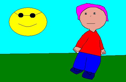 Poika ottaa aurinkoa. Hei!!!! Auringolla on pojan aurinkolasit!!! senkin varas >:(